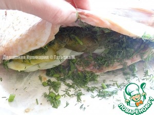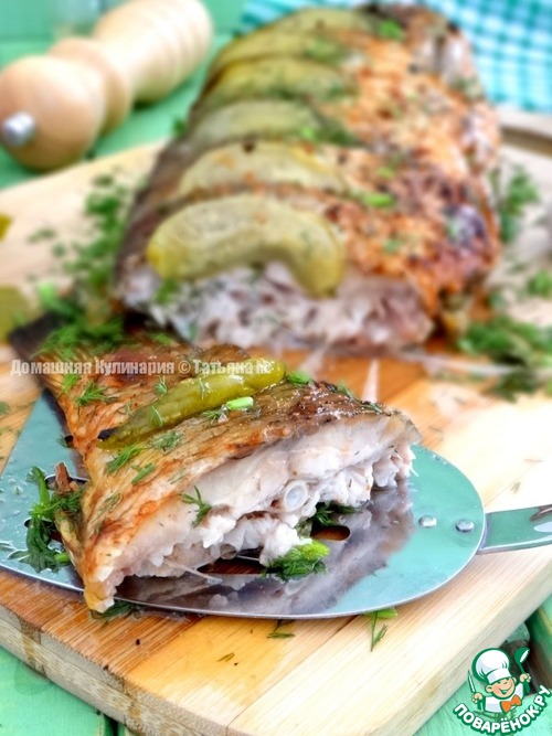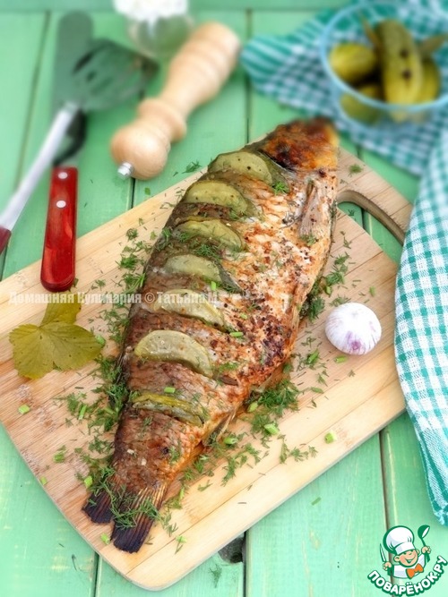В брюхо рыбы вложить кольца лука, кольца огурцов, рубленный укроп и смородиновые листы от огурчиков (ну это если они есть); -