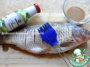 С помощью кисточки обмазать каждый надрез, брюхо, внутри головы и снаружи всего карпа - салатным соусом с кунжутом; -