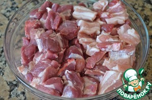 3. Мясо нарезать на кубики. Изначально я купила лопатку, но потом увидела свежайший розовый бекон и решила добавить и его.