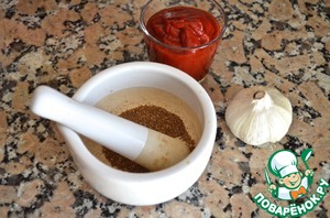 5. Соус желательно сделать накануне, чтобы он настоялся. На сухой сковороде обжарить зерна кориандра, чтобы они стали более ароматными, и растереть их в ступке. Чеснок пропустить через пресс и вместе с порошком кориандра, сахаром, солью и перцем добавить к томатной пасте и размешать. Влить достаточное количество питьевой воды, чтобы соус приобрел консистенцию жидкой сметаны. Если ваша томатная паста сладкая, сахар добавлять не нужно.