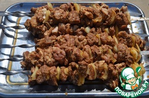 7. Нанизать мясо и лук на шампуры.
