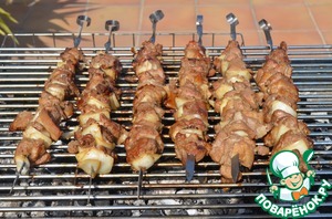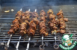 8. Готовить над горячими углями, периодически переворачивая шампуры.