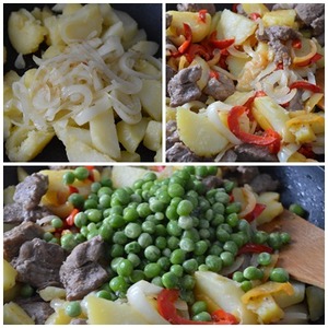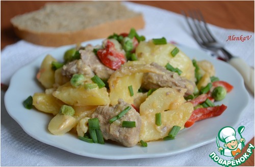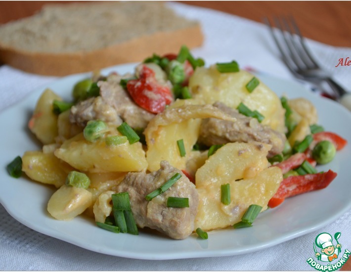 [+5]Немного изменила последовательность и время приготовл.мяса: сначала обжаривала мясо, а затем все остальные овощи в мясном сокУ. Мясо тушится у нас долго, поэтому мясо+ лук + перец залила сливками и тушила 45 мин., затем - горошек и обжар.картофель.