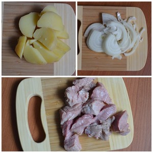 Картофель отварить в мундире до готовности. Затем дайте остыть, очистите и нарежьте крупными дольками. Лук очистите и нарежьте тонкими кольцами. Перец нарезать полосками (я использовала замороженный перец). Мясо вымыть, обсушить и нарезать ломтиками.
