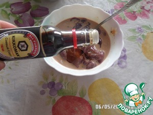 Промытую куриную печень нарезаем средними кусками и кладем в чашку. Добавляем сливки, соевый соус и молотый душистый перец.