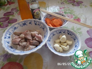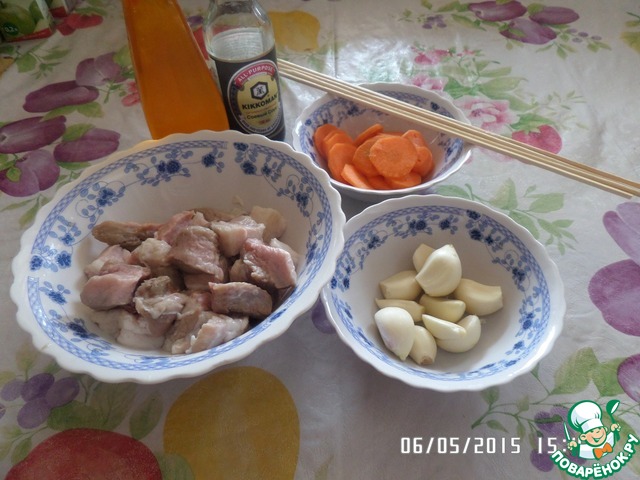 мясо нарезаем небольшими кусками, морковь - кольцами.