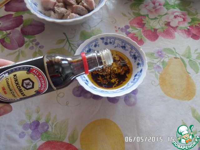 • В чашке смешиваем соевый соус, горчичное масло и пару зубчиков измельченного чеснока. Перемешиваем.