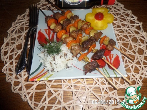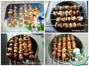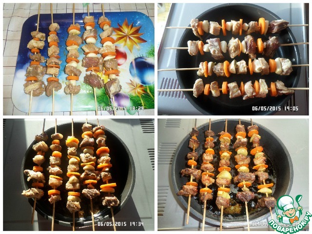 • На шпажки нанизываем мясо, зубчик чеснока, кружок моркови и т. д. Выкладываем шпажки на противень, закрепив их на бортиках.