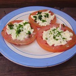Помидоры нарезать шайбами и уложить на тарелку. Поверху намазать нашим кремом украсить петрушкой и готово.