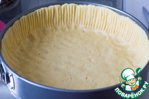 Затем необходимо распределить тесто по форме (у меня форма разъемная, диаметром 28 см.), при этом сделав бортики. Бортики можно разровнять вилкой, выходит очень симпатично! Проколоть тесто вилкой и отправить в холодильник на 30 мин. Кстати форму нет необходимости смазывать, т. к. тесто и так жирное.