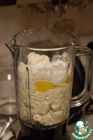 В блендер засыпать творог, добавить 1 яйцо и оставшийся белок, засыпать сахар (4 ст. л.) и пакетик ванильного сахара, добавить 4 ч. л. крахмала. Хорошо все перемешать, до однородной массы.