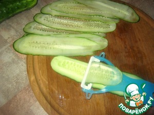 Режем огурцы пополам и вот таким ножиком делаем ровные полоски с огурца.