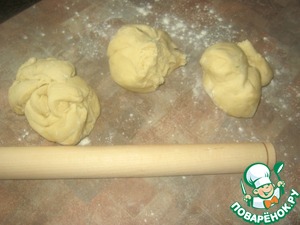 Полученное тесто разделим на 3 части (в результате у меня вместо 3 коржей вышло 4-из обрезков как раз получился четвёртый и ещё немножко на фигурки разные осталось)
