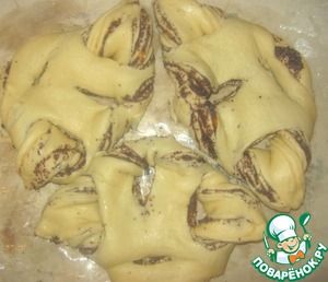 Выкладываем на противень, застеленный пекарской бумагой (её я смазываю маслом слегка), посыпаем маком, смешанным с корицей и сахарной пудрой и так чередуем все 4 круга
