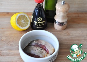 Маринуем рыбу в соевом соусе "Киккоман", лимонном соке, оливковом масле, посыпаем свежемолотой смесью перцев.