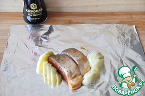Берём лист фольги, сворачиваем вдвое, посредине кладём маринованный лосось. Вокруг кладём отваренный в "мундире" картофель, нарезанный на сегменты.