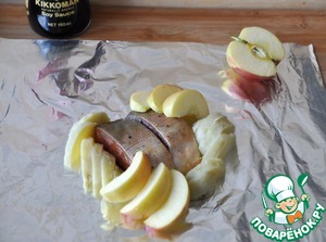 Берём яблоко, удаляем сердцевину, режем на сегменты и также кладём вокруг рыбы.