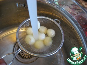 Мелкий лук, очистить, ошпарить кипятком и тут же промыть под струей холодной воды