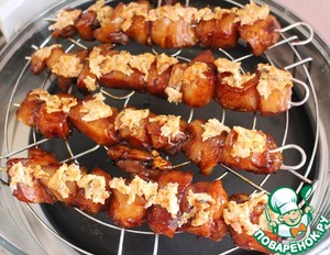 Я готовила в аэрогриле при 220 градусах 15 минут. Переворачивать шашлык надо, когда бекон немного расплавится.