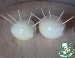 Репчатый лук почистить. Взять зубочистки (или поломанные пополам деревянные шпажки). Для луковицы средней величины нам потребуется 5 зубочисток. Воткнуть одну зубочистку в центр луковицы. По 2 зубочистки нужно разместить слева и справа от центра примерно на одинаковом расстоянии друг от друга. Втыкаем зубочистки достаточно глубоко. Для наглядности увеличьте фото.