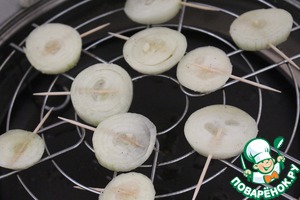 Нарезать лук кольцами между воткнутыми зубочистками. Получается "лук на палочке".