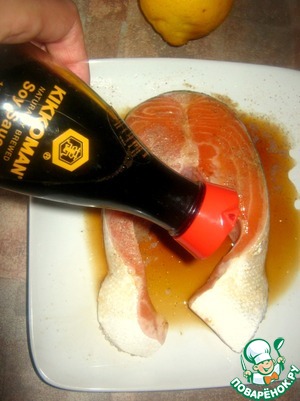 Поливаем стейк соевым соусом ТМ "Kikkoman"и снова оставляем минут на 15-20... переворачиваем пару раз обязательно, пропитывая рыбу соусом.