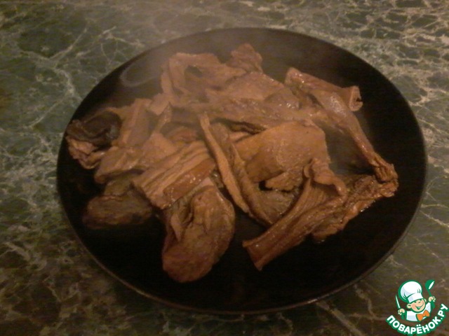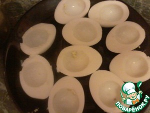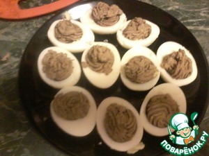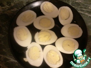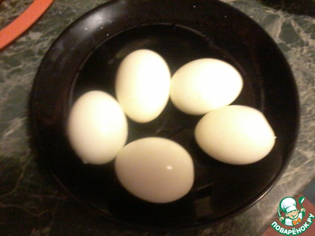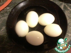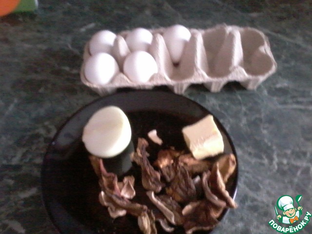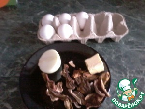 Грибы намочить в воде на час, хорошо промыть и отварить. Тоже около часа. Яйца отварить вкрутую.
