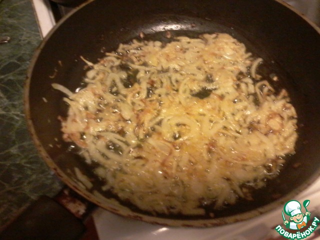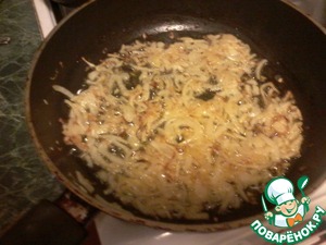 Лук нарезать 1/4 кольцами и обжарить на сливочком масле