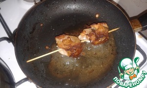 Кусочки рыбы одеть на шпажки, обмакнуть в кляр и обжарить на растительном масле со всех сторон