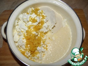 Добавить к яичной массе творог, натертую лимонную цедру, манную крупу, ванилин. Все взбить до пышности