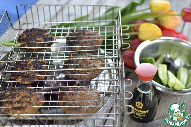 Изначально, мы хотели сделать котлетки а-ля люля-кебаб- на деревянных шпажках, но при формировании, котлетки начали падать и пришлось сделать просто котлетки на решетке. -