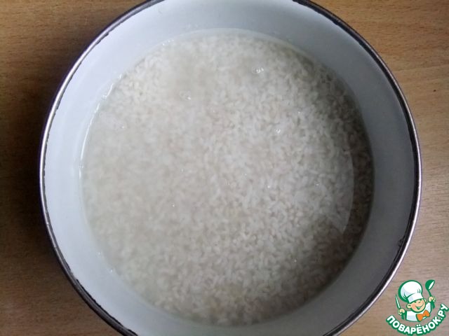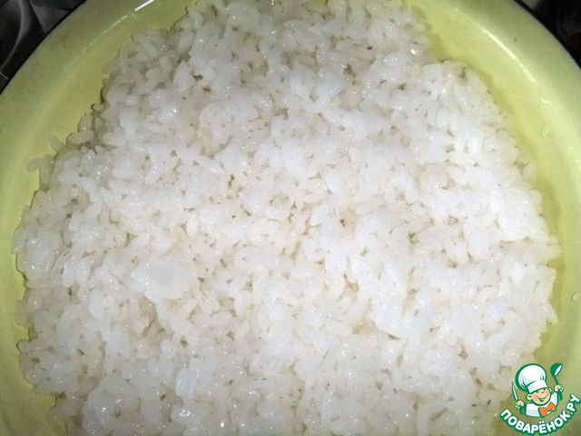 Слить воду и выложить рис в кипяток, по объему в три раза больше крупы. Отварить до готовности на тихом огне. Откинуть на сито и дать полностью остыть. Рис должен быть мягким, но рассыпчатым!
