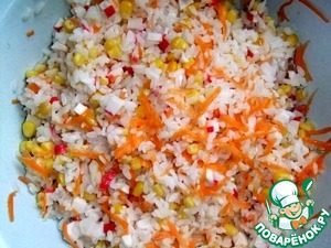 Добавить остывший рис и все перемешать. Посолить по вкусу. При подаче заправить майонезом.