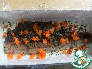 На дно налить немного желатиновой массы, дать слегка застыть и уложить филе сельди. Посыпать мелко нарезанной зеленью и морковью.