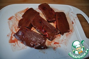 Берём говяжью печень, удаляем плёнки и жир и режем на куски около 1-1,5 см.