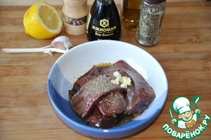 Поливаем печень соевым соусом ТМ "Киккоман", соком лимона, оливковым маслом, выдавливаем чеснок, посыпаем сухим базиликом и свежемолотой смесью перцев. Оставляем мариноваться на 15 минут.