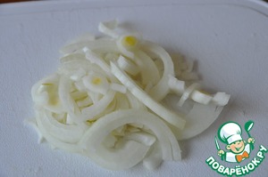 Пока печень маринуется, нарезаем лук тонкими полукольцами, посыпаем солью и слегка приминаем.