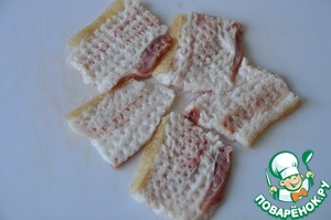 Режем сало (бекон) тонкими пластиками, отбиваем. Если шкурка жёсткая, то убираем.