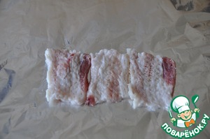 Фольгу складываем вдвое, на середину кладём несколько кусочков сала.