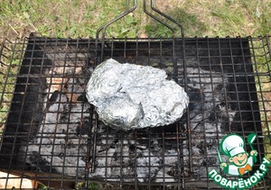 Хорошо заворачиваем фольгу, чтобы не выливались соки. Кладём на решётку мангала и запекаем около 20 минут.