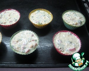 Раскладываем творожную массу по силиконовым формочкам для кексов и ставим в разогретую до 200 градусов духовку.