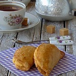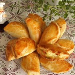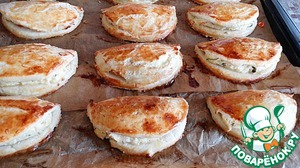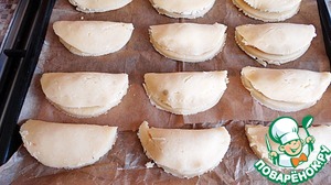 Перенесём сочни на застеленный пекарской бумагой противень. Смажем взбитым яйцом и поставим в нагретую до 200 гр. с духовку на 15-20 мин. Я ещё в конце включила верхний гриль, чтобы они у меня немного зарумянились.