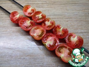 Помидоры вымыть, разрезать на половинки и нанизать на шампуры.