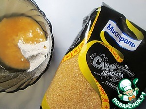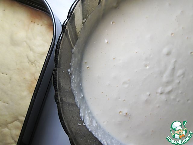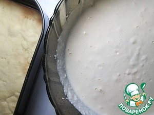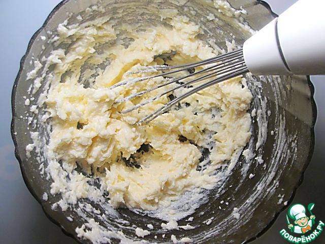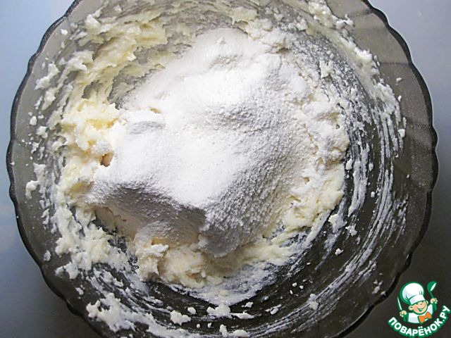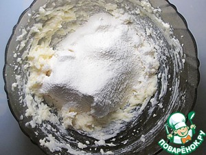 • Выпекайте корж в духовке в течение 15 минут при 180 градусах Цельсия. Сливочное масло взбейте с 30 г сахарной пудры и ванилином, постепенно добавляя по 1 желтку и небольшому количеству творога, взбивайте смесь на средней скорости. Добавьте крахмал и еще раз перемешайте смесь миксером.