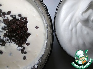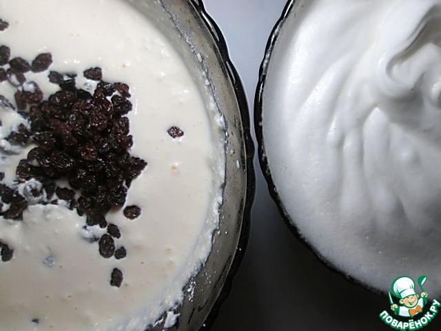 • Белки взбейте с оставшейся сахарной пудрой и солью в крепкую пену. Добавьте к творожной смеси изюм, перемешайте. Аккуратно соедините творожную и белковую массы, стараясь, чтобы белки не потеряли объем. Выложите творожную массу на песочный корж, сверху украсьте полосками из теста, тесто смажьте желтком. Выпекайте около 50 минут при 180-190 градусах Цельсия до зарумянивания.