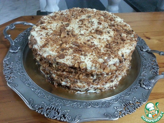 1-2 коржа и образки теста измельчите в крошку. Промажьте каждый корж большим количеством крема, сложите их один на другой, обмажьте остатками крема торт с внешней стороны и обсыпьте его крошками от коржей. Поставьте торт в холодильник на ночь для того, чтобы он пропитался.
