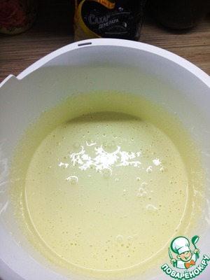 Яйца, сахар и соль взбивать в течение 5 минут на максимальной скорости, до пышной светлой массы.