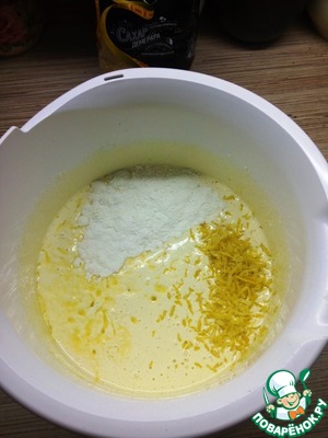 Муку просеять с разрыхлителем. К яичной массе добавим ванилин, размягченное сливочное масло, цедру и сок лимона, так же по частям добавим муку с разрыхлителем. Хорошо перемешать, можно миксером.