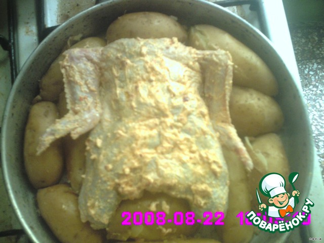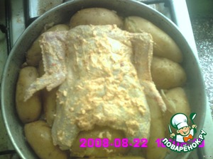 • Смазываем осторожно курицу со всех сторон полученной смесью и выкладываем на смазаный противень, вокруг укладываем картофель, он поможет сформировать курицу окончательно.