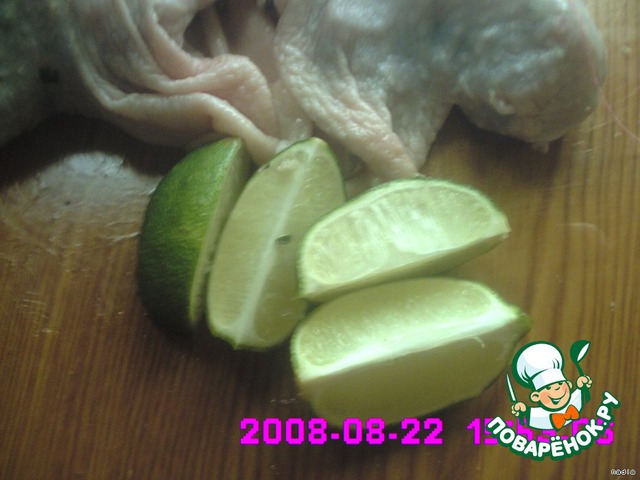 • Вкладываем разрезанный на 4-е части небольшой лимон , две части в грудь и брюшко, и по кусочку в ноги. Зашиваем брюшко.